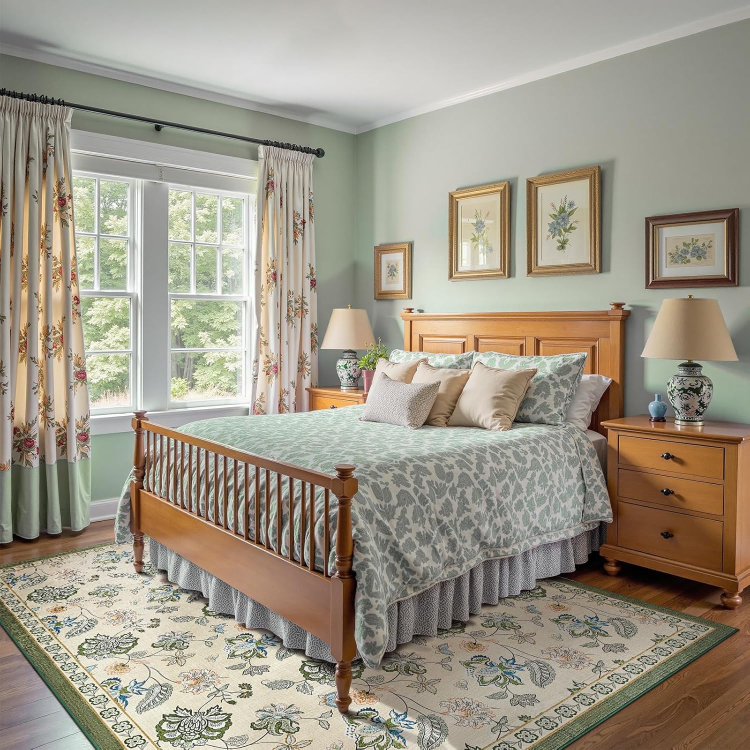 jinchan 8x10 Floral Rug for Living Room Washable Bedroom Rug Vintage Romance Design Non Slip Thin Indoor Floor Cover Large Low-Profile Throw Carpet for Dining Room Office, Green/Beige