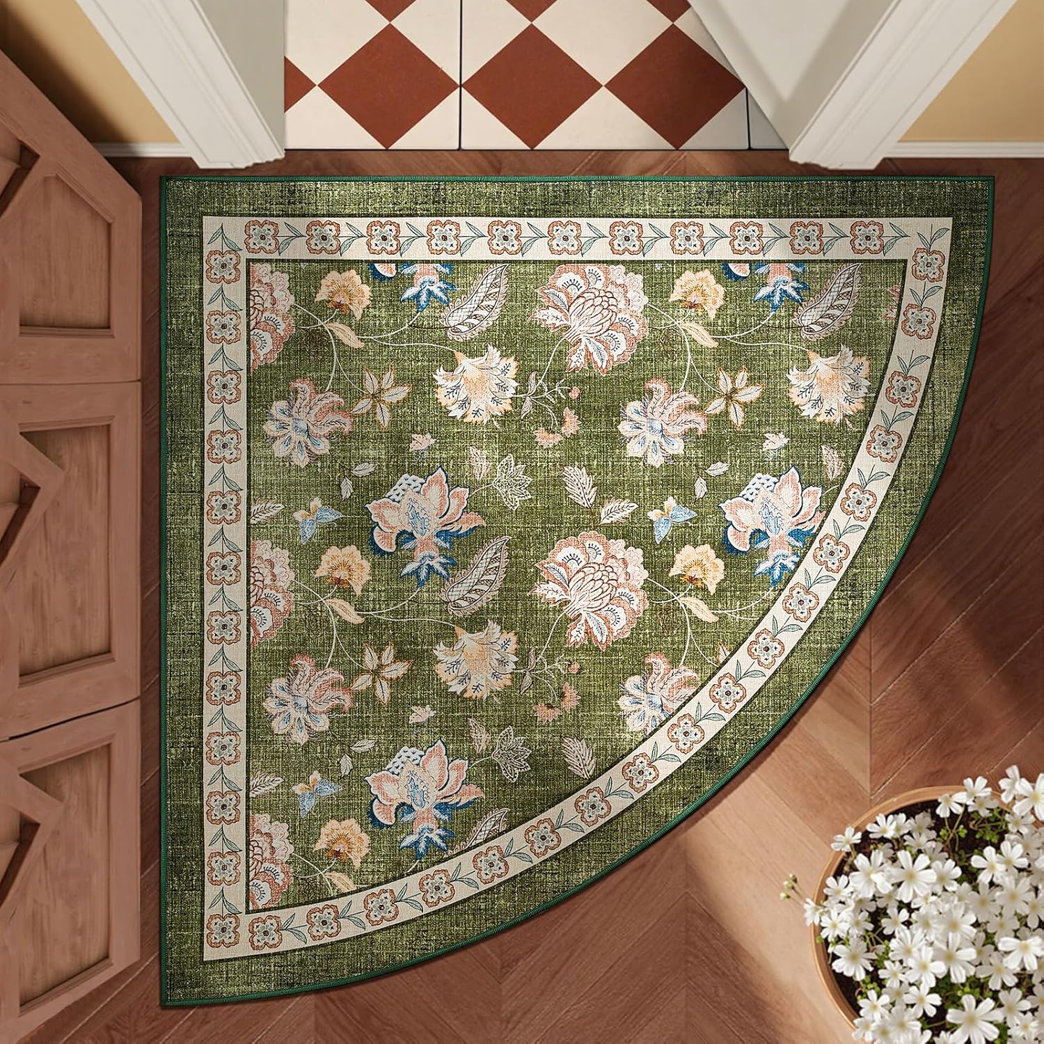 jinchan Floral Corner Rug for Entryway Washable Kitchen Rug Vintage Romance Design Non Slip Quarter Circle Lightweight Low-Pile Throw Carpet for Playroom Reading Nook Nursery, 4ft Radius, Green
