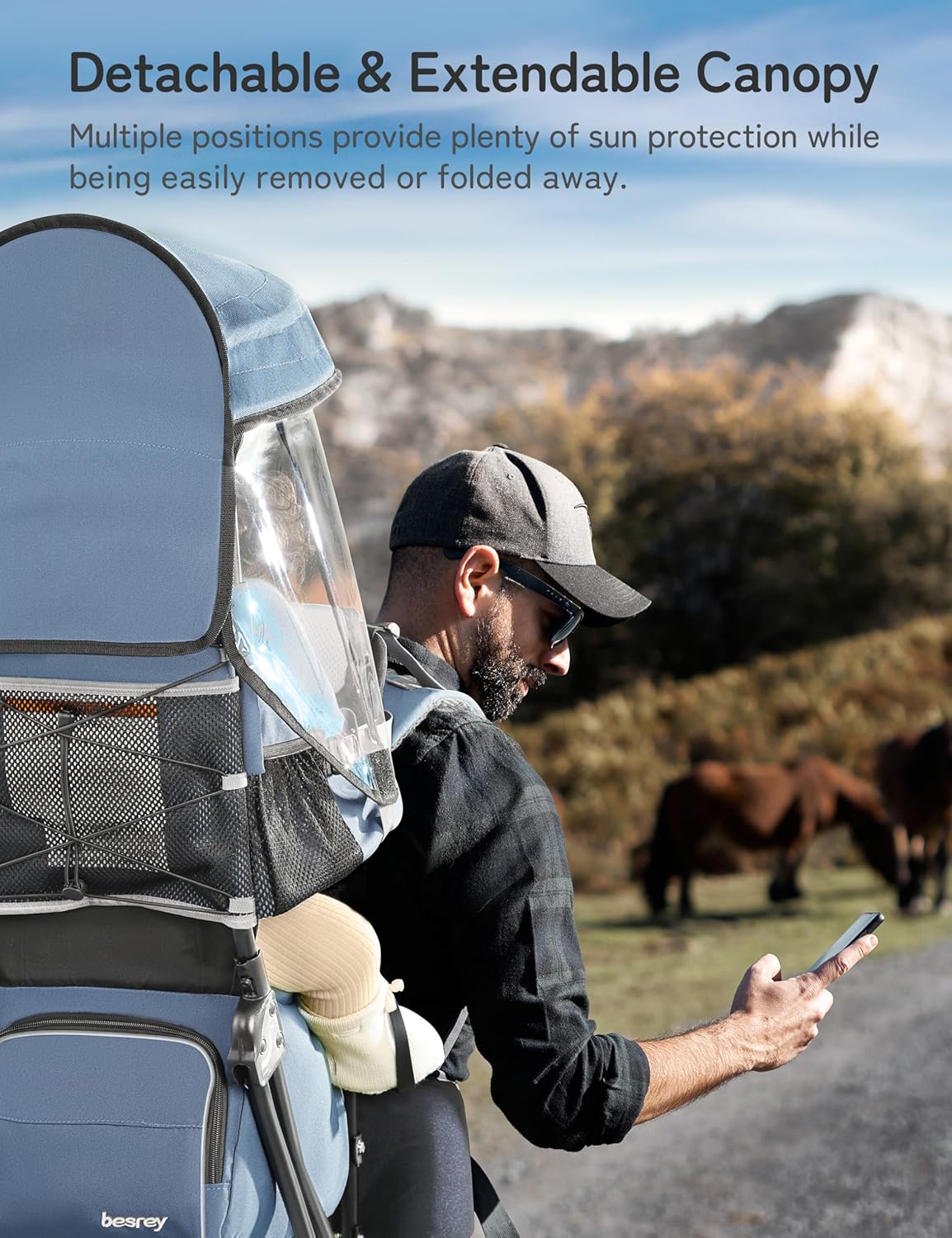 besrey Baby Backpack Carrier, Toddler Hiking Backpack with Safety 3-Height Seat, Adjustable Straps&Waist Belt, Foldable Frame Lightweight Large Capacity Child Carrier for Hiking (Haze Blue)