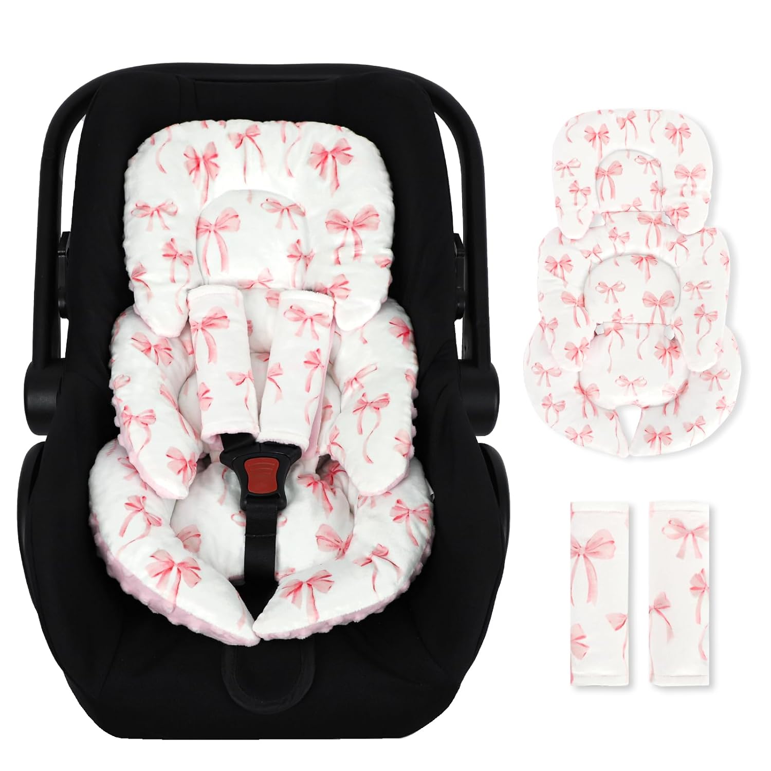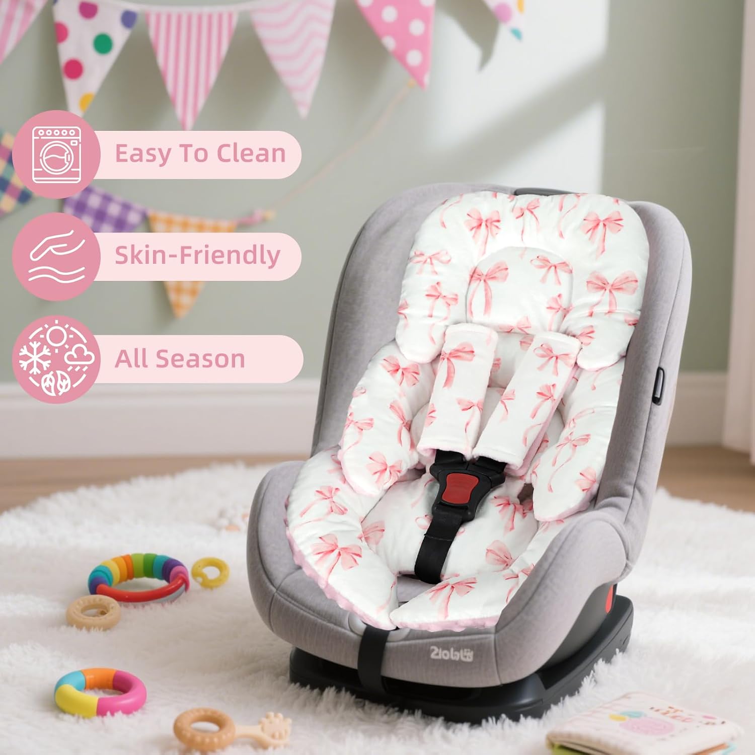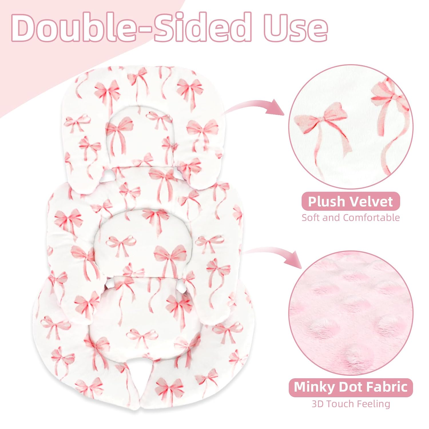 Infant Car Seat Insert Cushion, Baby Car Seat Head Body Support for Girls & Boys, Reversible Newborn Car Seat Insert with 2 Extra Strap Paddings, Premature Car Seat Cushion, Pink Bow