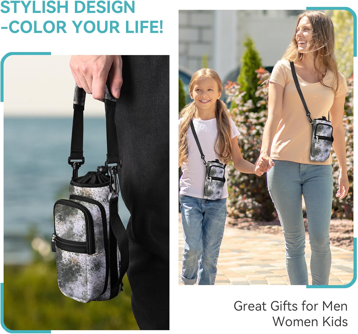 • icolor Crossbody Water Bottle Carrier Holder Pouch with Call Phone Bag have 4 size 25oz(Diameter 3.23",Height 9.05")/32oz(Diameter 3.82",Height 7.87")/40oz(Diameter 3.82",Height 9.05")/64oz (Diameter 5.12",Height 9.06"),Adjustable Padded Shoulder strap about Min:27.1, Max:48.4"