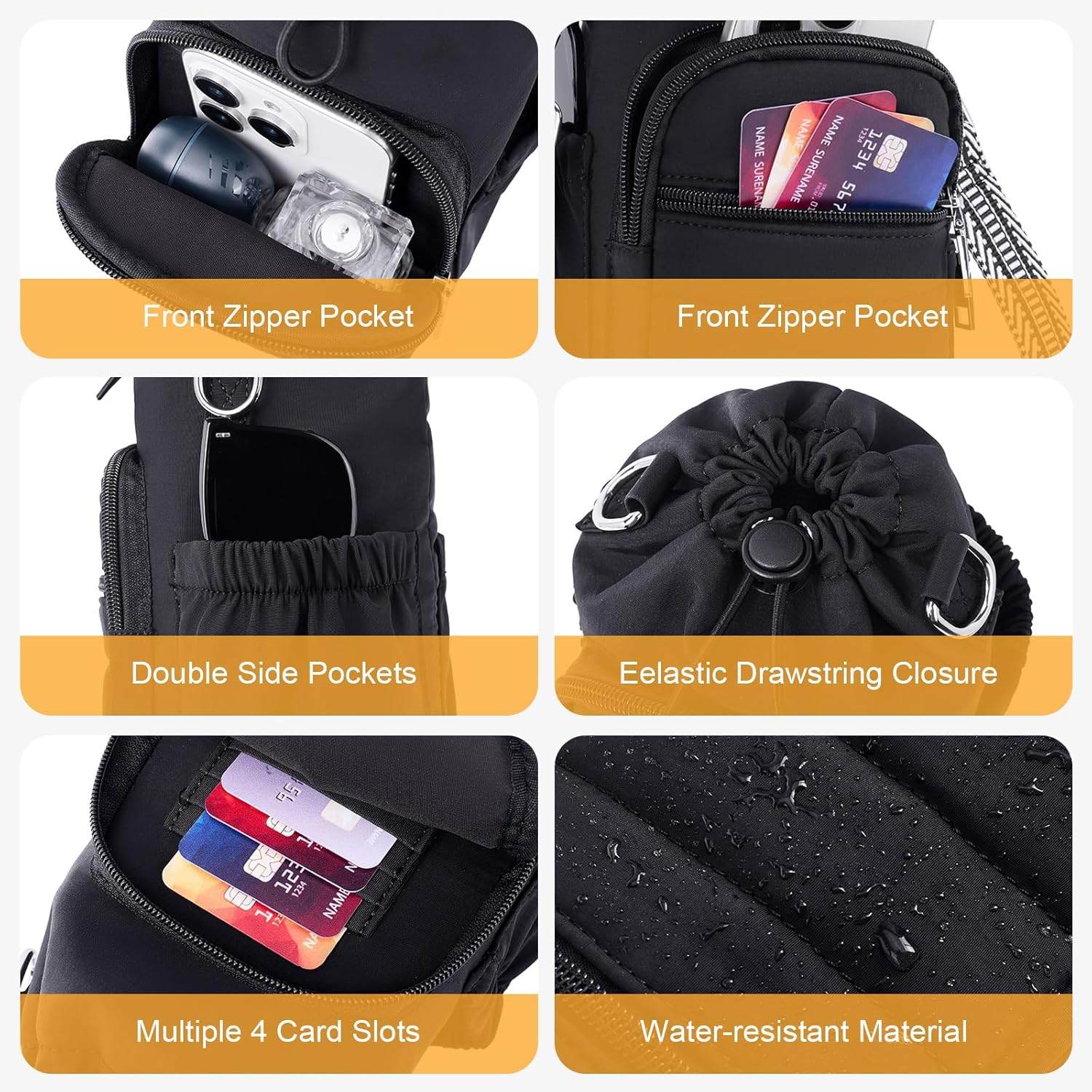 • 【 Functional Storage for Daily Essentials】 More than just a bottle holder—water bottle crossbody bag includes a zippered front pocket that fits large phones like the iPhone Pro Max, plus 4 built-in RFID card slots. Two side pockets easily store sunglasses, sanitizer, or other small essentials, making it perfect for everyday use.