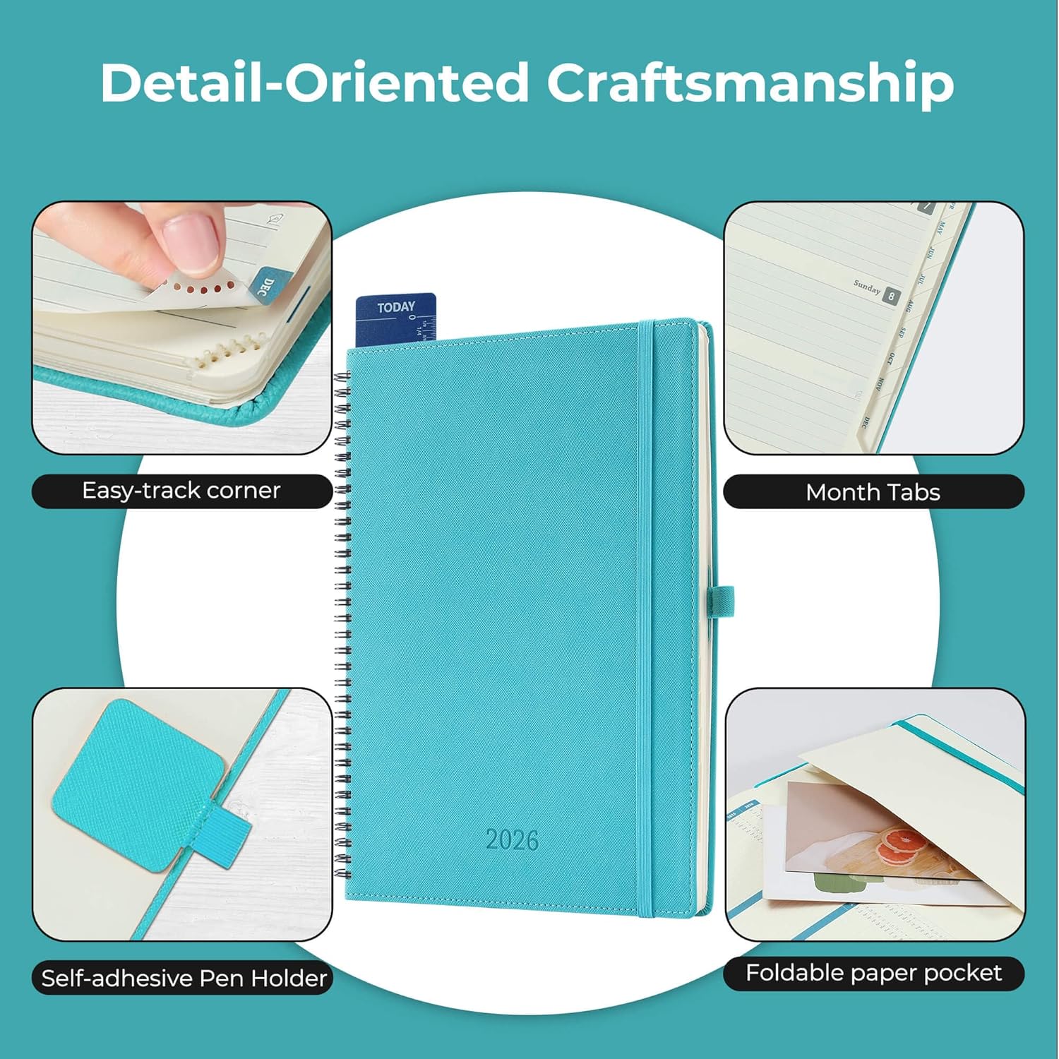 IN-LUXPRO Planner 2026 Daily Weekly and Monthly,11.5"x8.5",12 Months Spiral Bound Calendar Agenda with Self-adhesive Pen Holder,2026 Appointment Book with Vegan Leather Soft Cover,Light Blue