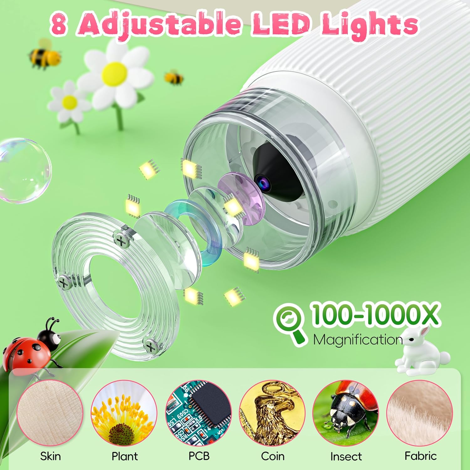 Microscope for Kids, Ahalfcit Microscope with 2'' Inch Screen -1000X Zoom Portable Camera, Birthday for 3 4 5 6 7 8 9 0 11 12 Years Old Kids,Science Educational Toys - White
