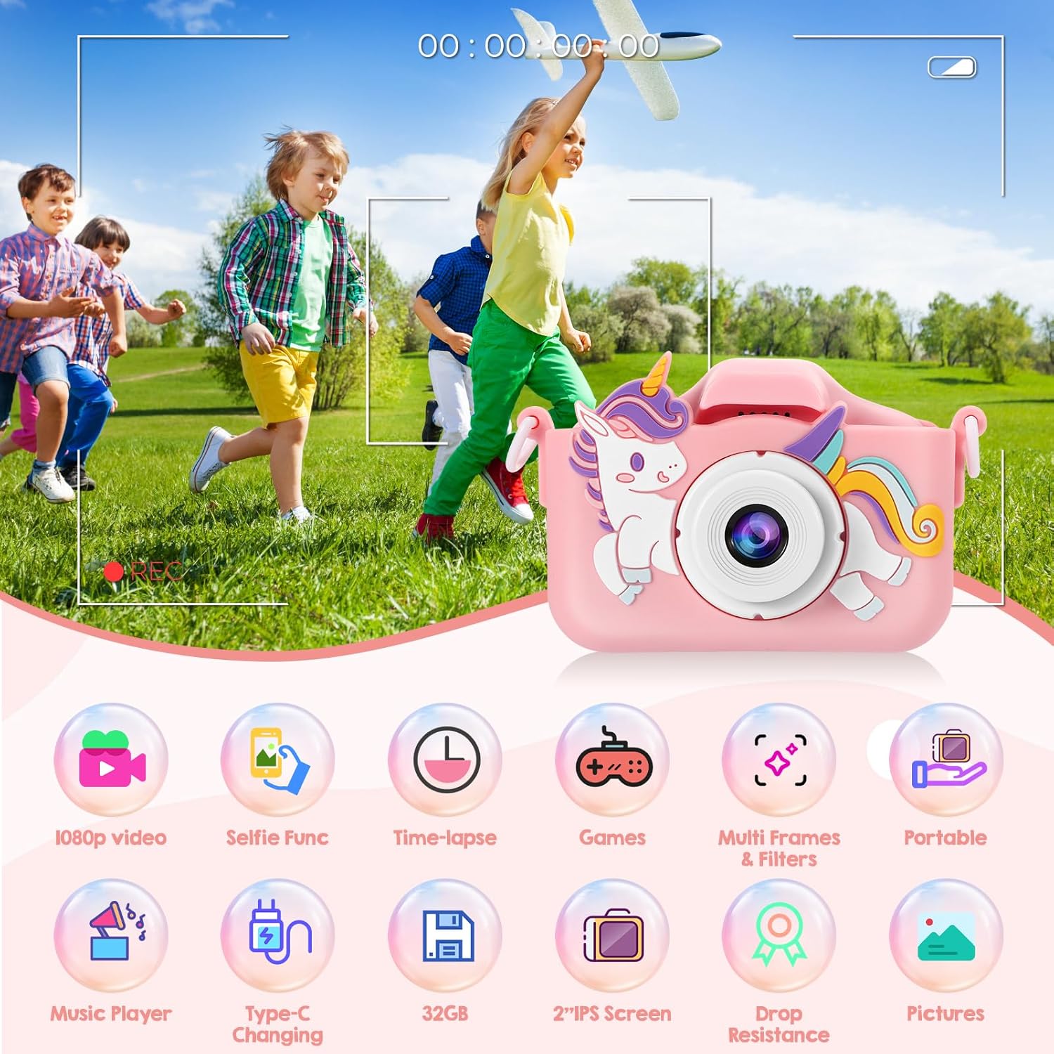 - Dual Lens & 1080P Video Recording: Kids camera can take beautiful high-definition photos, record videos, selfies, time-lapse shots, and children will have a lot of fun taking photos of themselves.
