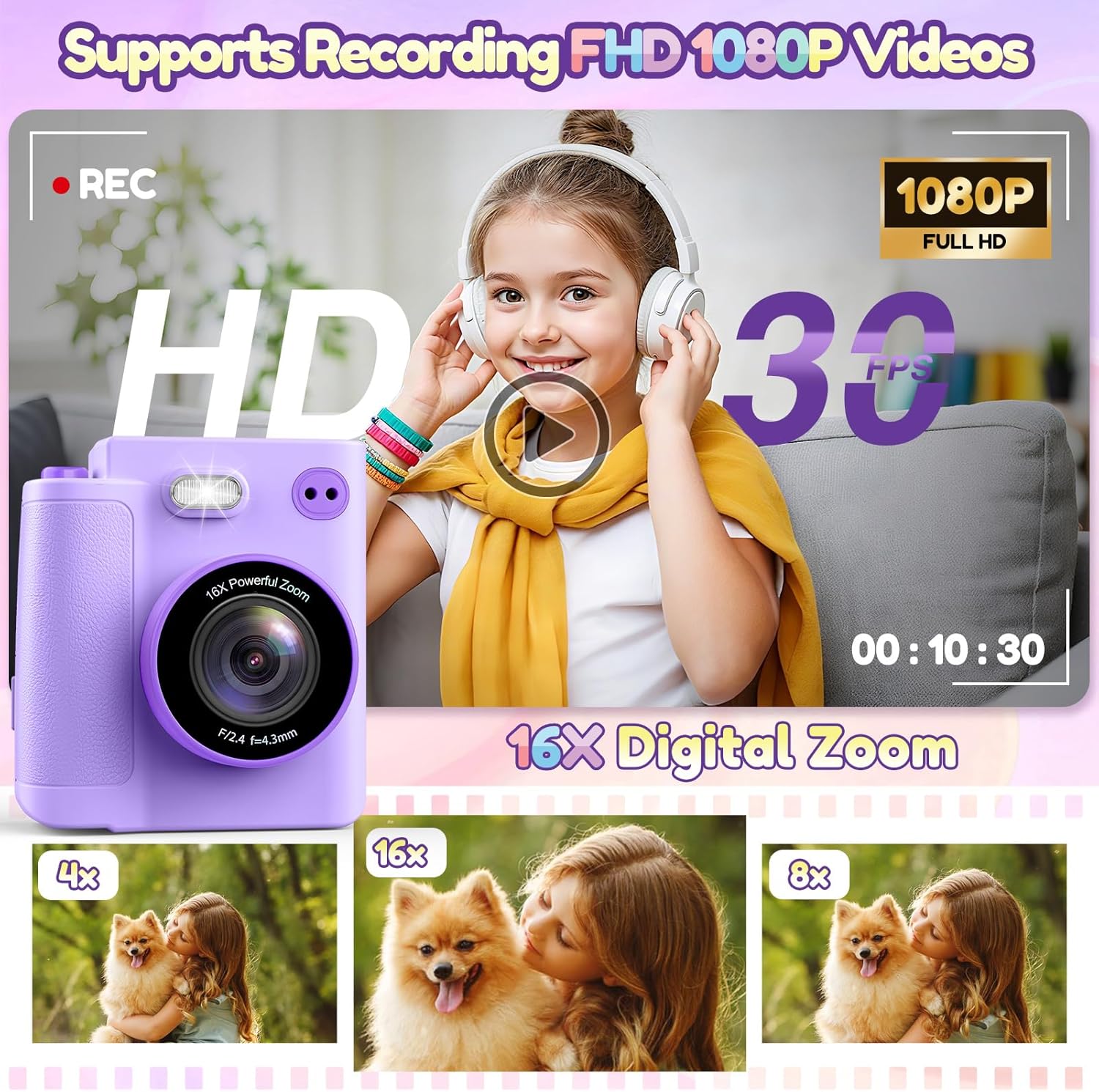 Kids Camera Gift for Girls: Selfie Digital Instant Print Cameras HD Camcorder Toys for Kids Teen Girls Boys Ages 3 4 5 6 7 8 9 10 12 Birthday Christmas Valentines Easter Gifts with 32G SD Card Purple