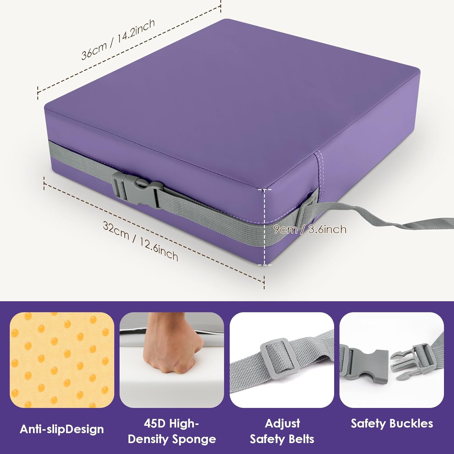 - ✅【High-Density Support Foam - Long-Term Comfort】:Built with a 50D high-density foam, this chair booster seat for toddler 2-12 retains its shape and density even with long-term use,supporting your child well during mealtimes. Whether used as a toddler seat cushion, a kid booster seat for dining table, or even for floor play, your little one stays comfy and secure.Size:14.2 x 12.6 x 3.6 + 14.2 x 14.2 x 2 inch, total 2 pcs