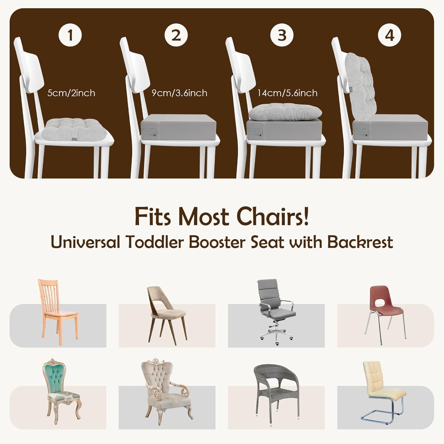 - 🪑【Upgrade 2-in-1 Toddler Booster Seat for Kitchen Chair & Dining Table】:This toddler booster seat includes a seat cushion + backrest set designed for most kitchen chairs and dining room chairs. Compared to other single booster seats, our kitchen chair booster seat adds a Separable backrest cushion, helping them maintain proper sitting posture.Whether it's breakfast, lunch, or dinner time, this dining chair booster seat toddler offers the ideal elevation and support for children aged 2-12 years.