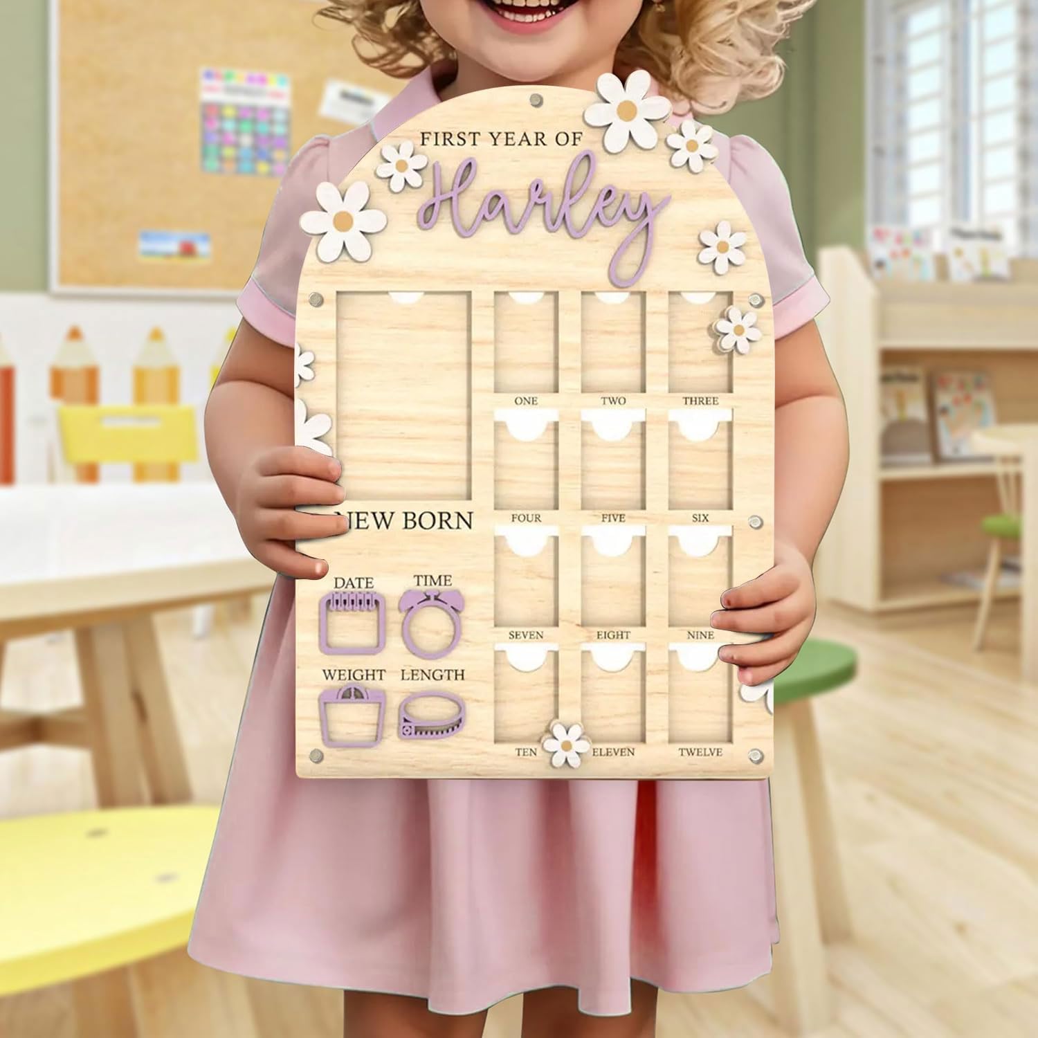 - Capture your baby’s first year with our babys first year photo frame. This baby first year photo frame helps you record their growth from newborn to one year, showcasing each milestone in a 12 month picture frame for baby first year. The wooden plaque includes space for your baby’s full name, making it a personalized keepsake. Our my first year photo board, one year photo board is a wonderful way to celebrate these moments, and the nursery picture frames add a special touch to any room.