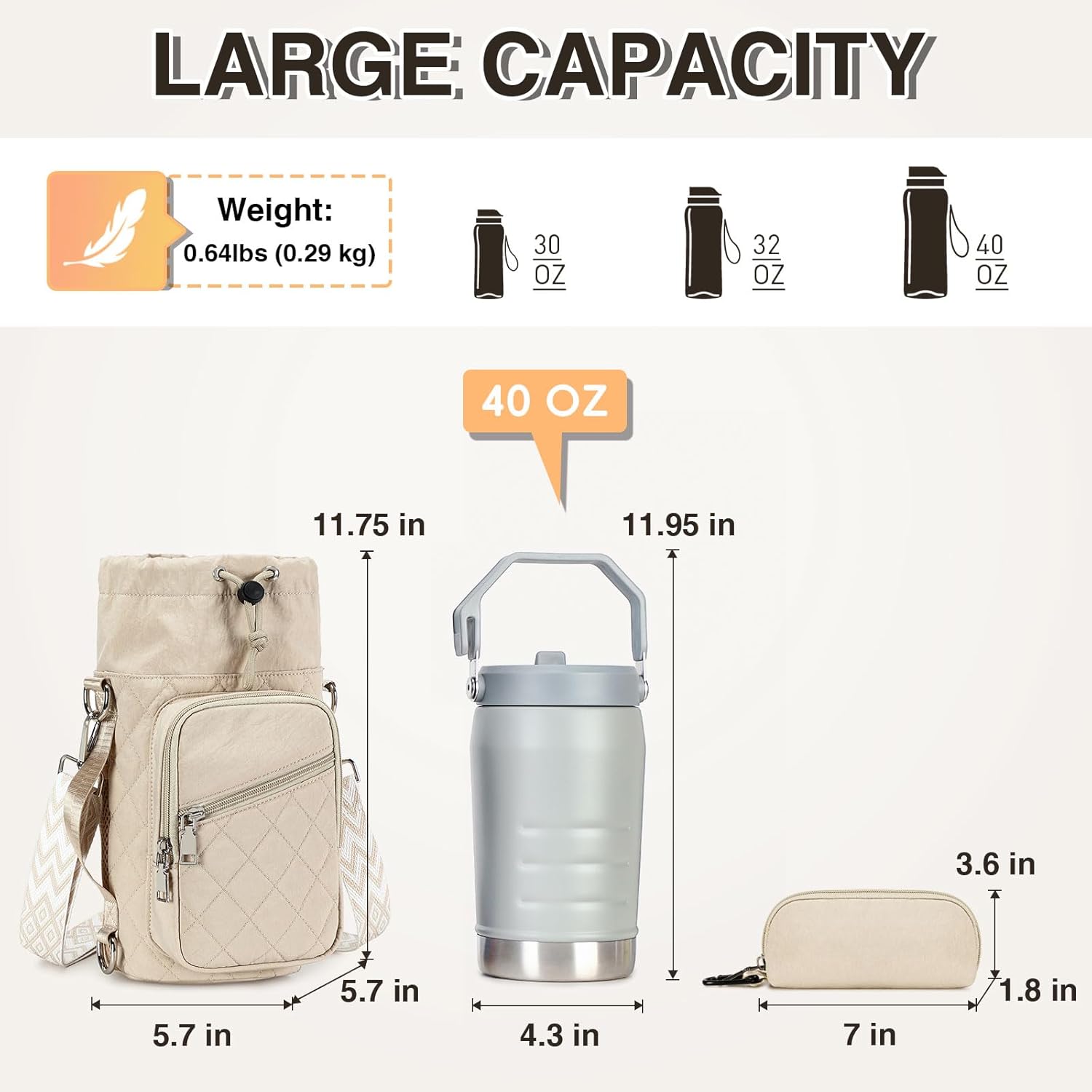 - 【Portable and Hands-Free Handle Strap】This Stanley bottle carrier bag features two straps: a short handle for handheld use and an adjustable shoulder/crossbody strap (29.9" to 55.1") for purse-like or body-worn carrying. The design offers enhanced portability and hands-free convenience. Whether you prefer to hold the bag in your hand or wear it on your body, this water bottle sling bag is ergonomically designed to accommodate various body types.