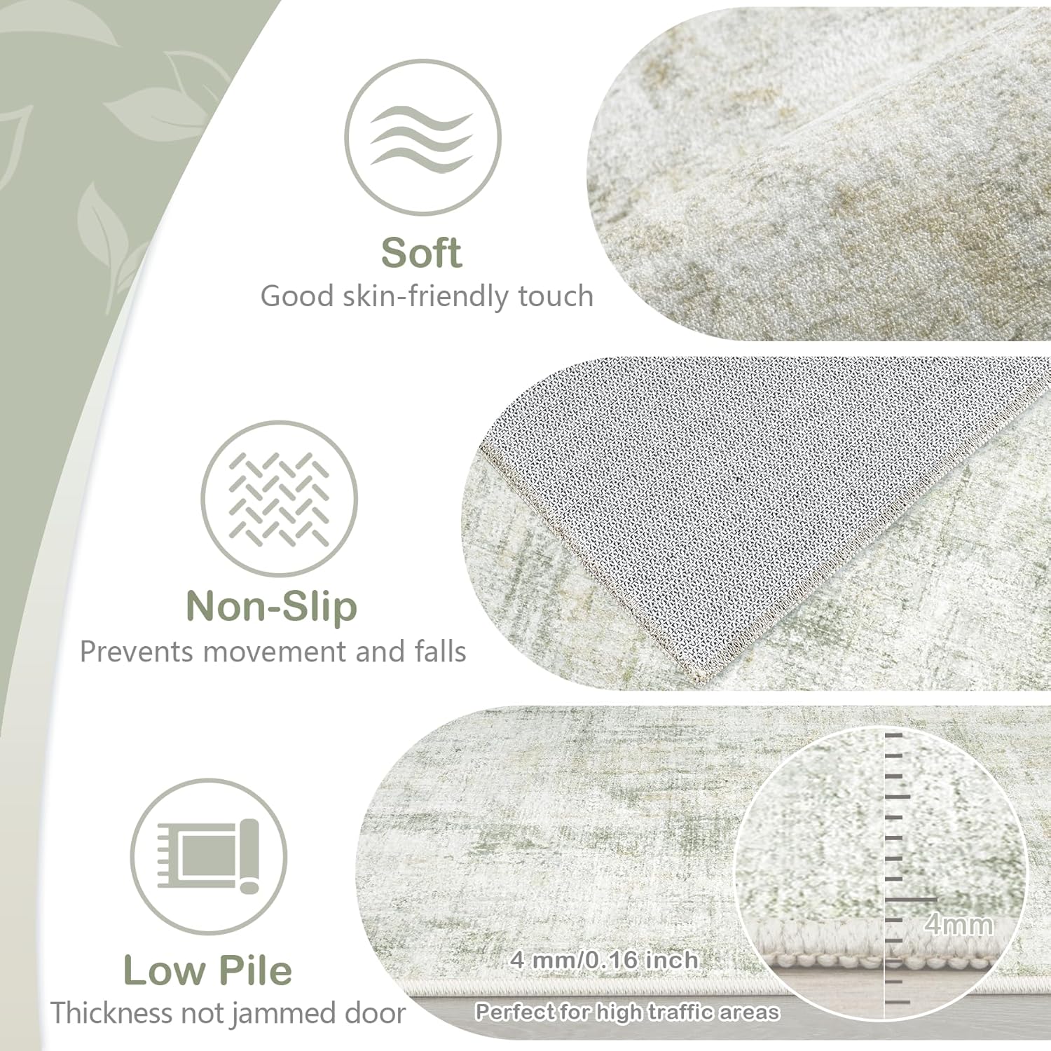 - Anti-Stain Low Pile Rug: Our washable rugs surface pile are short and dense, can block dust and hair embedded, spilled drinks coffee and other liquids will not penetrate into the neutral rug inside; Our 6'x9' large rug is moderately thick and won't snag on doors, which not only keeps indoor rugs clean, but also adds convenience for high traffic areas.