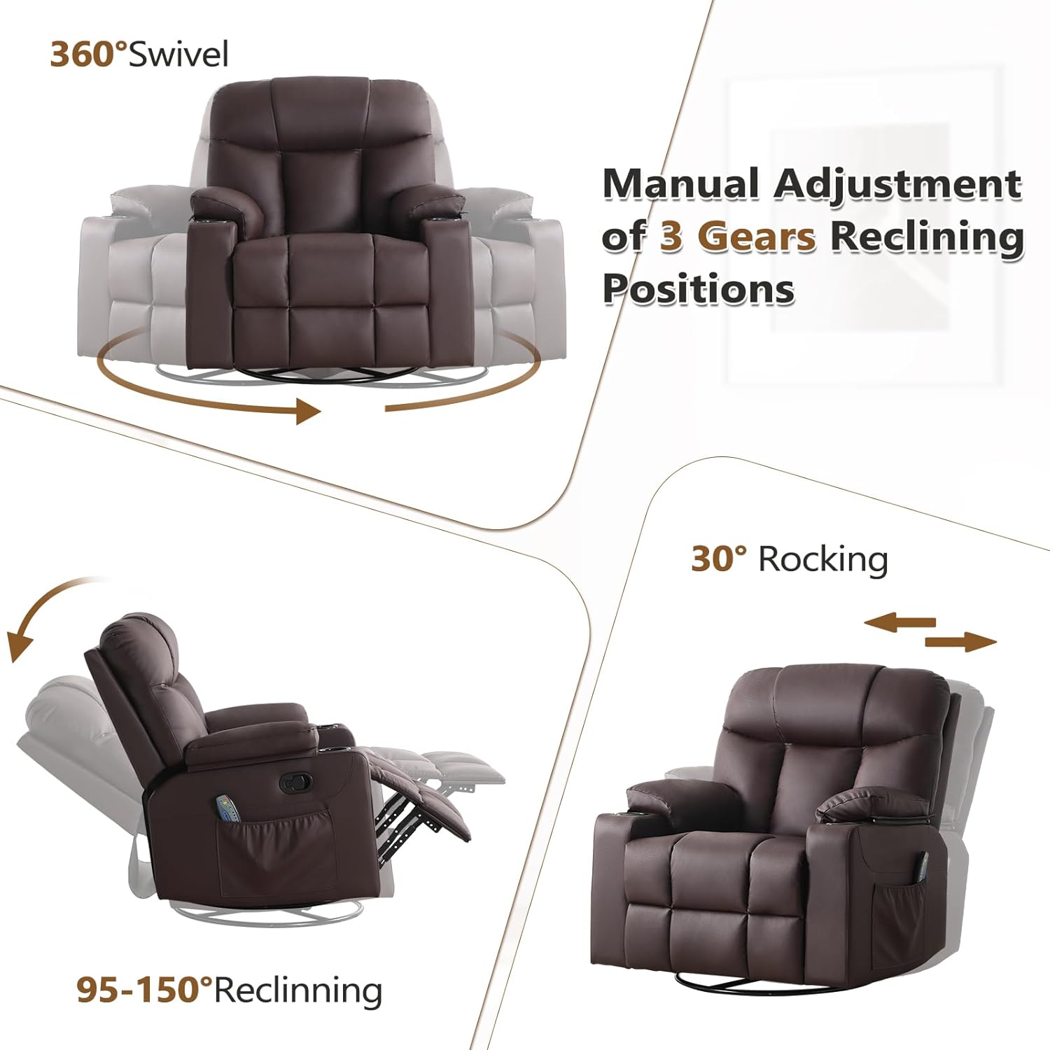 ANJ Swivel Rocker Recliner Chair, Manual PU Leather, 360° Swivel with Massage & Heat for Living Room, Brown
