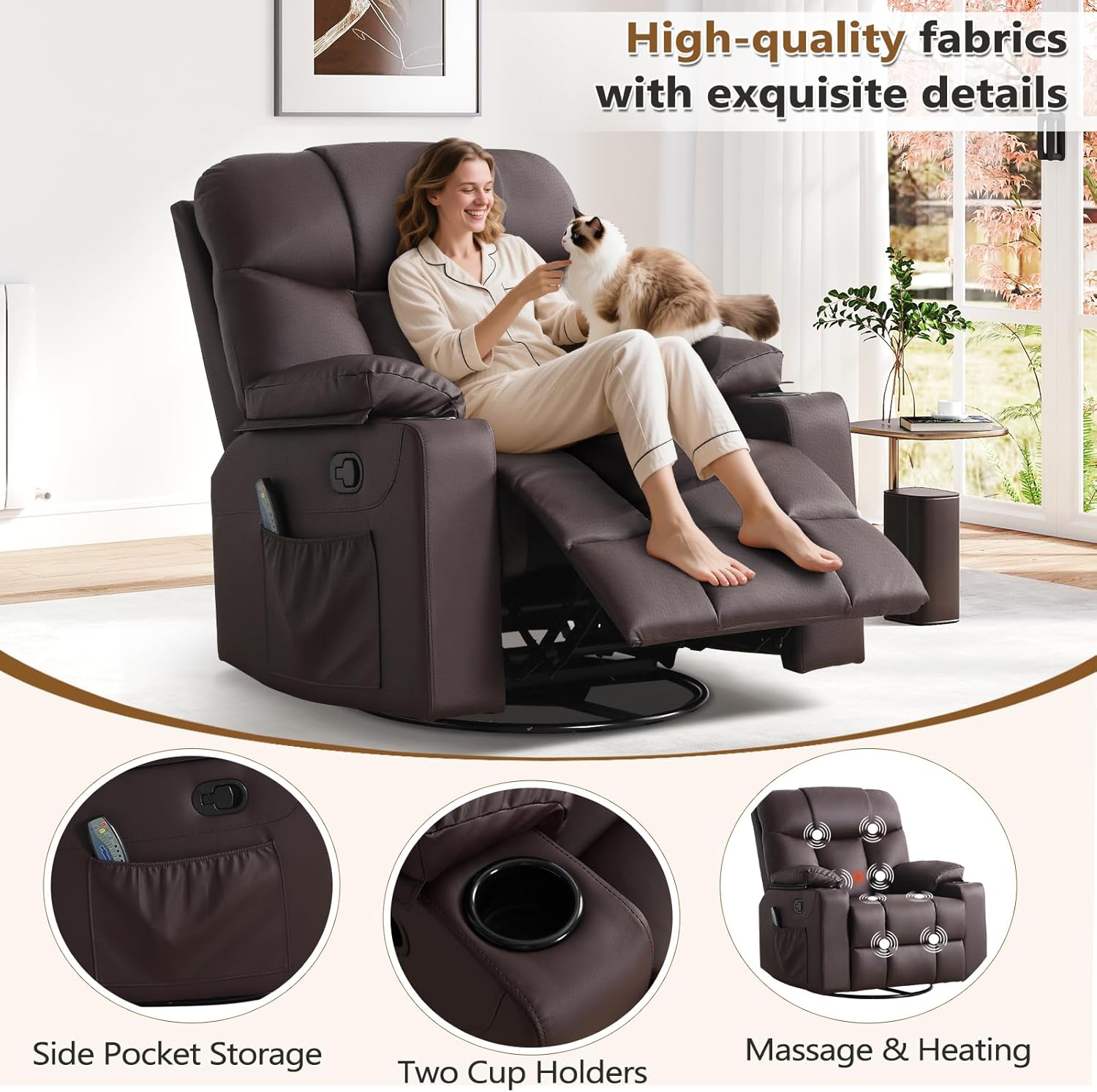 ANJ Swivel Rocker Recliner Chair Set of 3, Brown PU Leather, Manual 3-Position Reclining with Massage & Heat, Cup Holders for Living Room