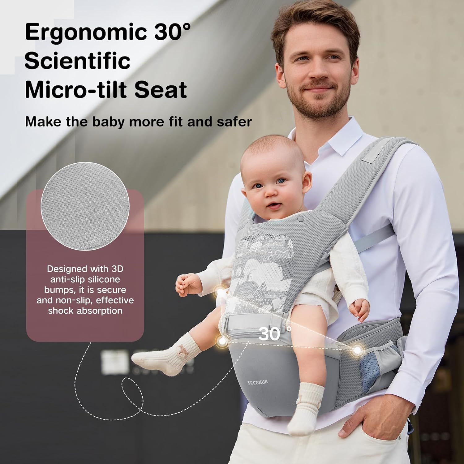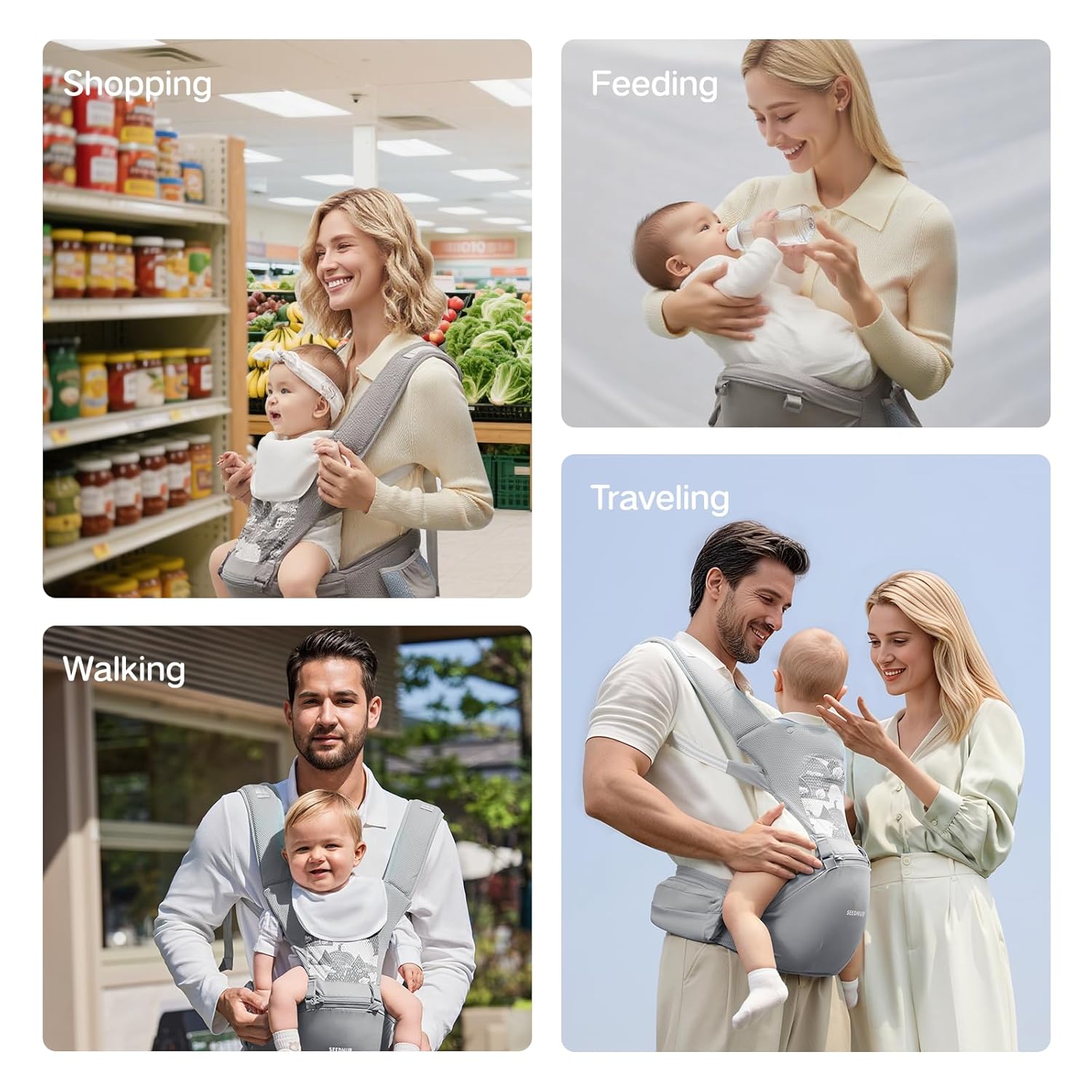 - 【6-in-1 Versatile Baby Carrier】SEEDNUR baby carrier offers 6 carrying positions—hip seat (sitting/lying) and carrier (front-in, front-out, back)—suitable from newborn to toddler. Adjustable straps and waist belt fit parents and babies of different body types.