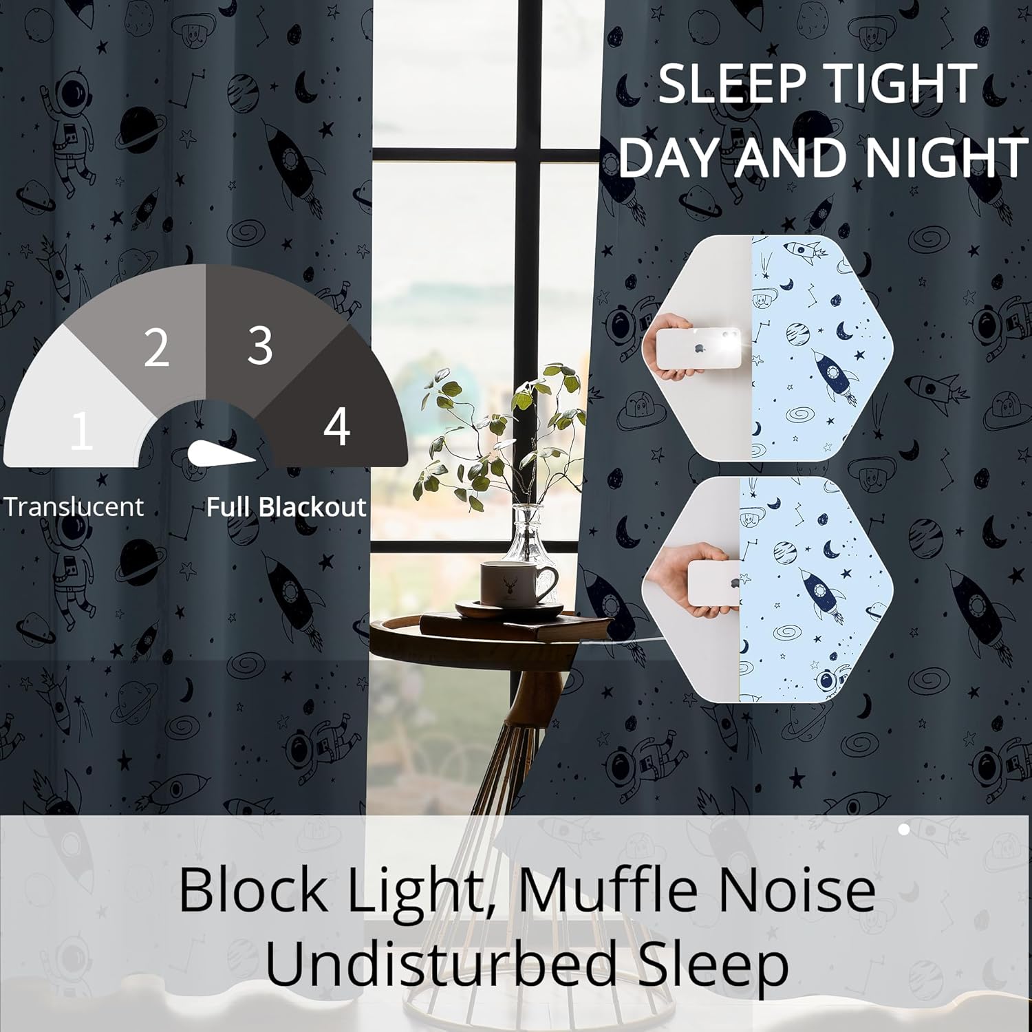 Kids Space Rocket and Astronaut Blackout Curtains - 100% Blackout, Thermal Insulated, Noise Reducing, Perfect for Kids Room and Nursery, 2 Panels (Sky-Blue Space Doodles, W52×L84)