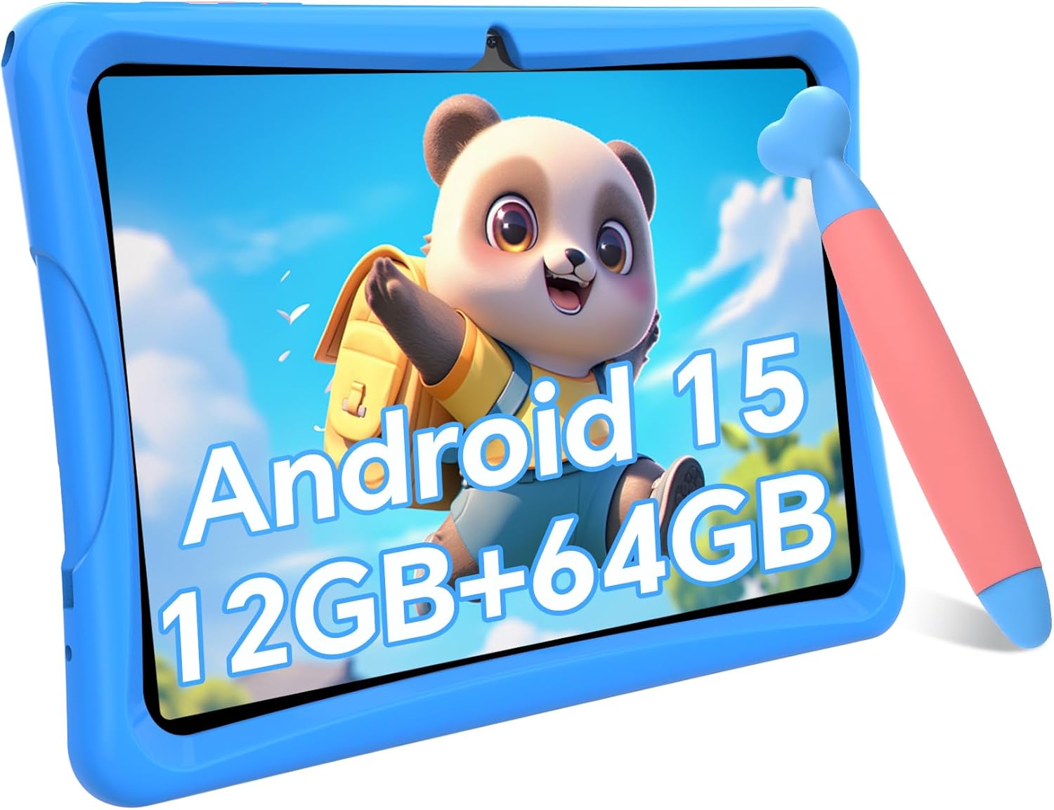Kids Tablet 10 inch, Android 15 Tablets for Kid, Parental Control, Pre-Installed Kiddos Software & Kids Space, Includes Case & Stylus Pen, 12GB RAM 64GB ROM, 2TB Expand, HD IPS Screen(Blue)