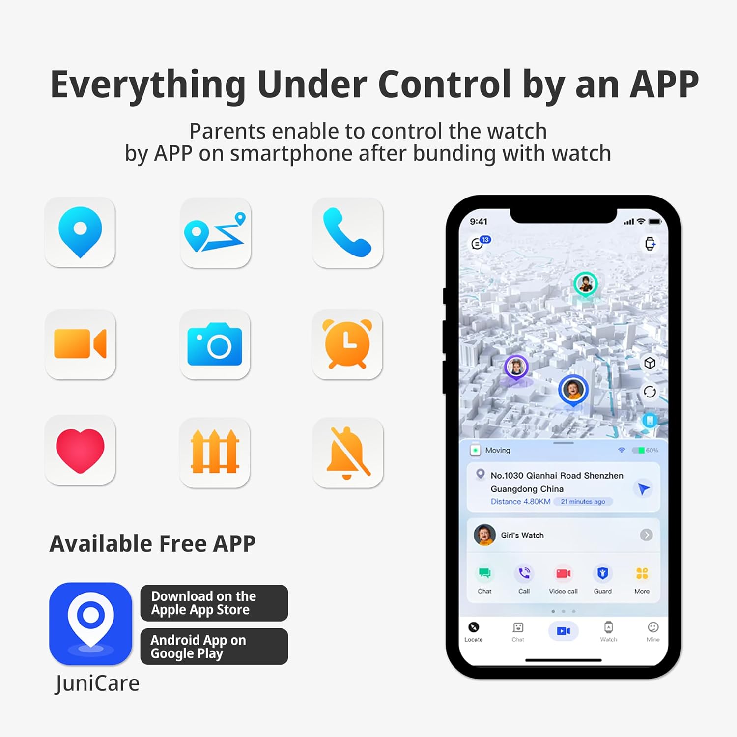 - 【Multifunctional Kids Smart Watch】- GPS watch for kids include real-time GPS location, phone call, video call, texting ,One-key SOS call, voice chat, camera, alarm clock, class mode, safety fence, pedometer, calculator, stopwatch, historical route, 5 puzzle games, Find Watch etc. You can also switch between 12 hour and 24-hour formats. Everything under control by an app, parents can complete all control of the watch through an app(JuniCare).